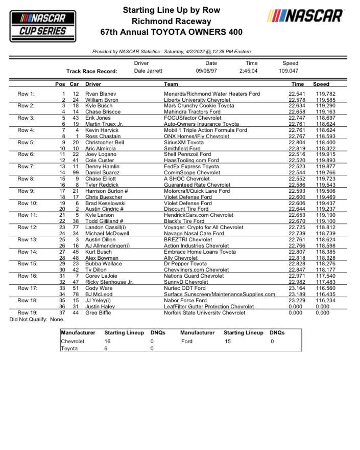 The thing is, Blaney did qualify in the top 4 rows in both races last year too but didn’t finish in the top 5 in either. Byron, qualified in the top 5 in 3 of his last 4 Richmond starts now too but has no top fives to show for that either.
