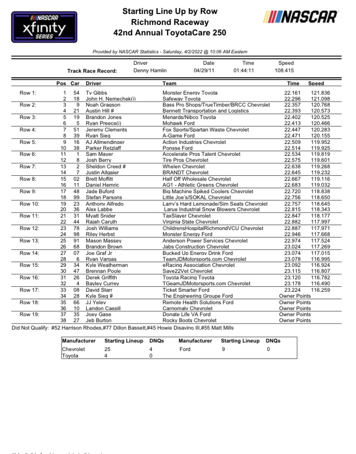 - 18 Nemechek – 5th in Phoenix as he also has a Truck win at Richmond (2021) to go along with being 3rd in last year’s NXS race too.