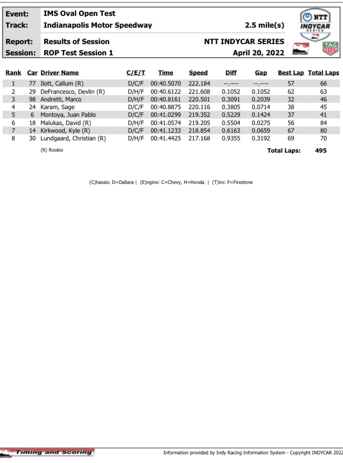 All five Indianapolis 500 rookies still needing to complete the Rookie Orientation Program – Kyle Kirkwood, Devlin DeFrancesco, David Malukas, Christian Lundgaard and Ilott – passed all three phases of the test today. Marco Andretti completed his refresher test, while two-time “500” winner Juan Pablo Montoya and Sage Karam will finish their refreshers Thursday.