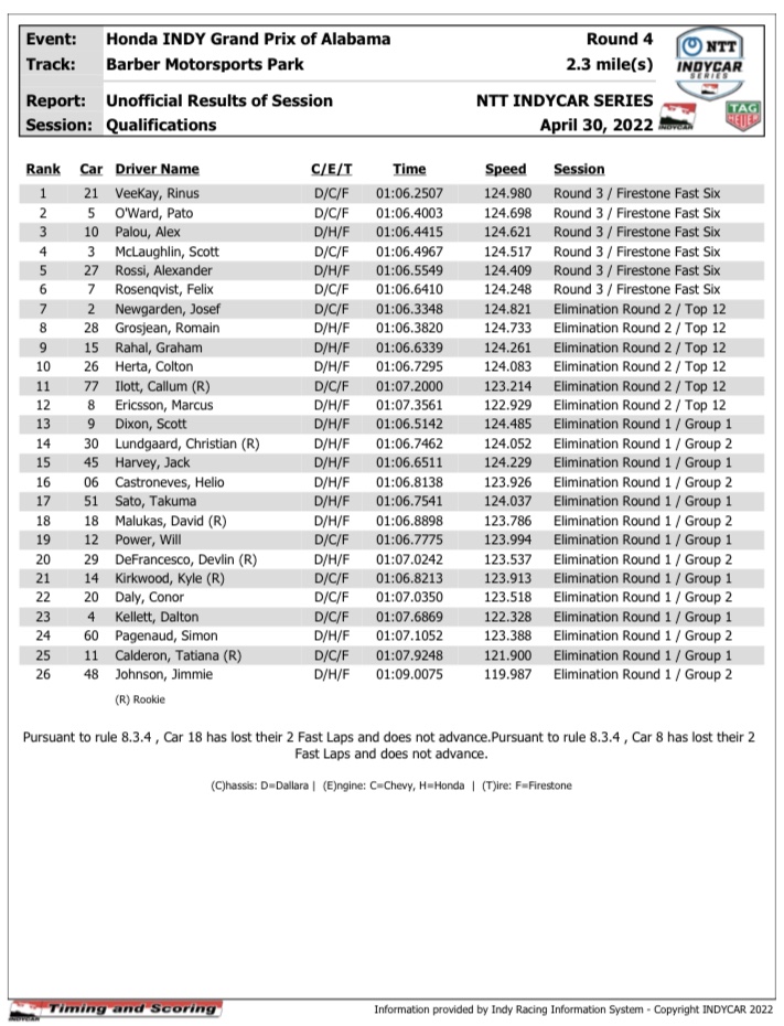 Instead, Grosjean was only 8th overall in the second round which wasn’t good enough to advance him to the Fast 6. He started 7th and finished 10th last year. Herta, went out too late and was caught out from Marcus Ericsson getting off course and ending the session a few seconds early. He’ll start 10th as a result. He came from 9th in the other 2 Barber races he’s competed in and was a DNF in both as well.