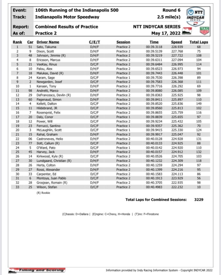 Sato’s teammate of David Malukas was 7th (226.448 mph in his No. 18 Dallara-Honda to give the Honda’s to give the manufacturer 7 of the top 8 speeds and all 5 Ganassi’s and both Coyne cars in the top 9.