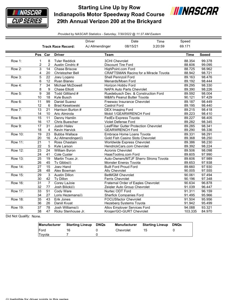 […] — For the 29th time, the NASCAR Cup Series comes to the famed Indianapolis Motor Speedway. However, 27 of the 29 came on the 2.5-mile oval. The last two were on the 2.439-mile road […]