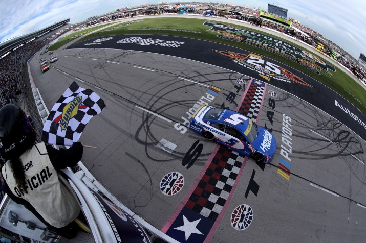 FORT WORTH, TEXAS – OCTOBER 17: Kyle Larson, driver of the #5 HendrickCars.com Chevrolet, crosses the finish line to win the NASCAR Cup Series Autotrader EchoPark Automotive 500 at Texas Motor Speedway on October 17, 2021 in Fort Worth, Texas. (Photo by Sean Gardner/Getty Images)