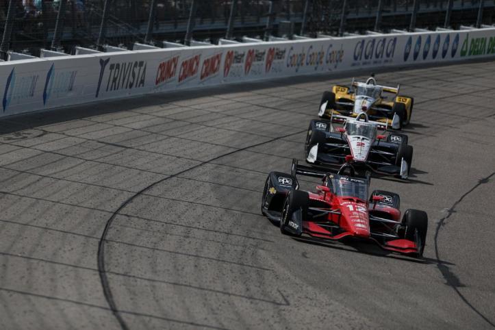 “So went on the outside. Had a good restart. Went on the outside of McLaughlin, and I think Rosenqvist was battling with Power and just to the narrow, and I got to the inside of him into three. So, yeah, it was a pretty good restart.”