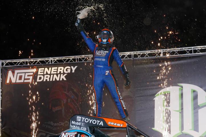 Justin Grant passed Emerson Axsom with a slider in Turn 1 with 10 laps remaining in the 30-lap A-Main feature to score his 15th career USAC National Midget Series victory under the lights on the .25-mile dirt track tucked in the shadows of Turn 3 of the big track.