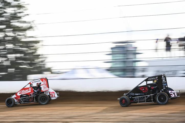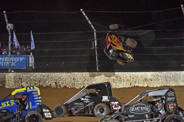 Front row starters Emerson Axsom and Thomas Meseraull traded blows early with Axsom leading Lap 1 but TMez passing the Franklin, Ind native on the top lane on Lap 2. The duo would have an intense battle early before a frightening crash on Lap 5 for Daniel Whitley who flipped end-over-end several times down the straight and got some massive air before landing in the Turn 1 catch fencing.